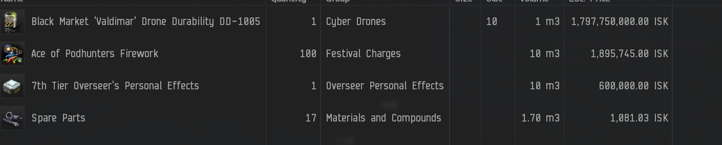 Keep in mind that regardless of the value of any overseer effect, each takes up the same volume in cargo - 10m3. They can fill up an Astero or Ishkur hull quickly. More than once I've had to jettison stuff to make room, bookmark the cargo container, then go back for it. Alternatively, dock as needed and dump things into an item hangar before going on the prowl again.